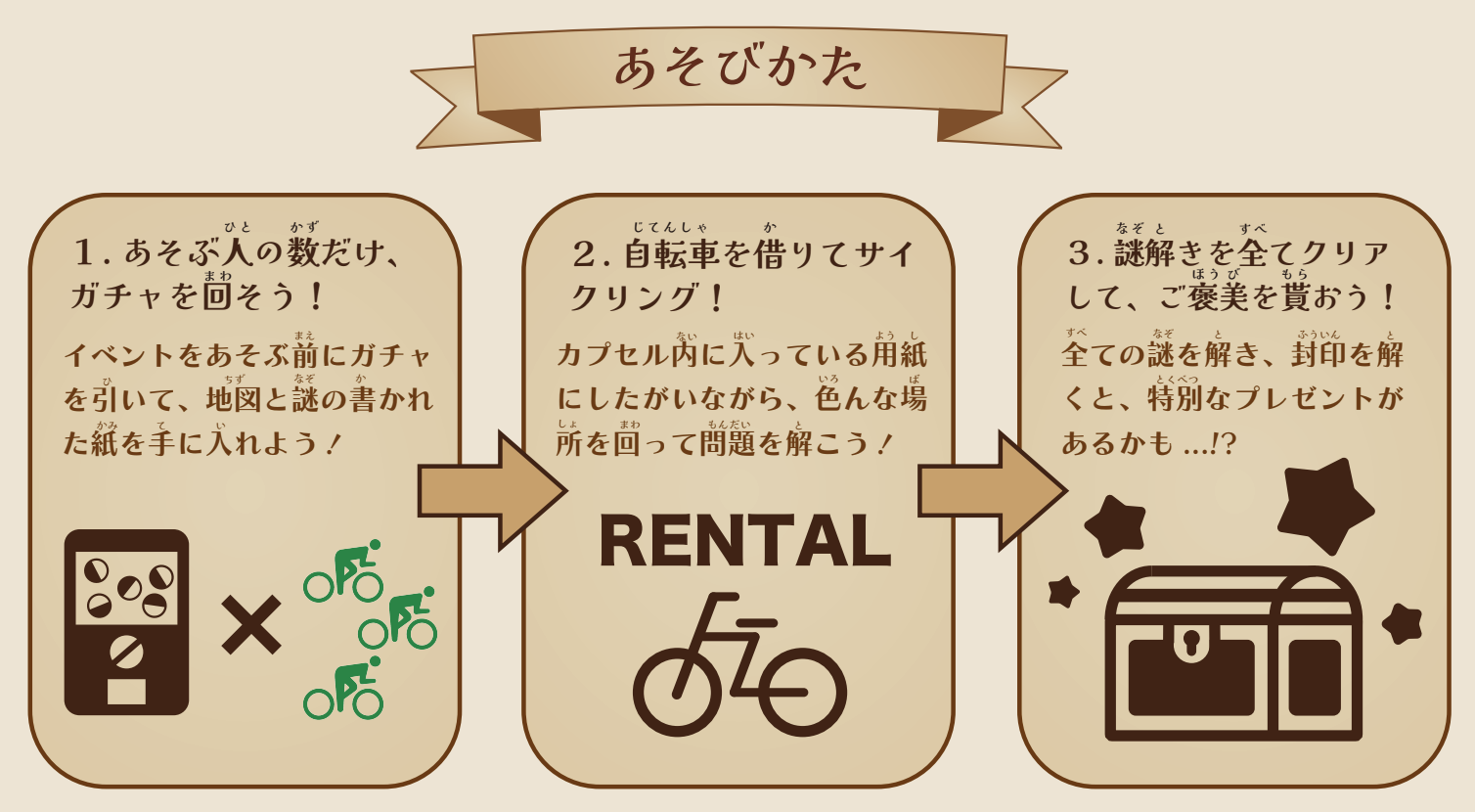 3つのお題をクリアした後に現れる最終キーワードを考え、レンタサイクル店舗に戻って報告すると、ご褒美のお宝を宝箱からゲットできます。